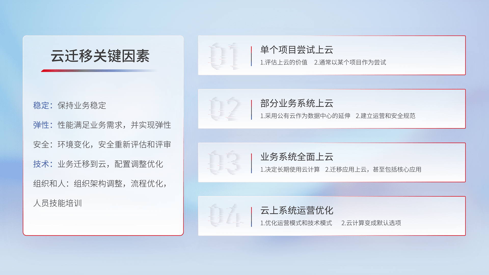 结合实际业务,,,,从规划设计、、、云平台选型、、、云原生改造、、、、数据迁移、、、、集成交付,,迁移全过程为客户识别最佳上云路径,,,,做好风险识别管理,,设计网络架构、、身份权限、、、安全审计合规、、、操作审计、、、日志审计、、、监控告警策略、、、多站点容灾设计等,,对云上基础设施进行整体规划,,,提升IT治理水平,,,,以满足弹性、、高可用、、、、高性能的需求。。。